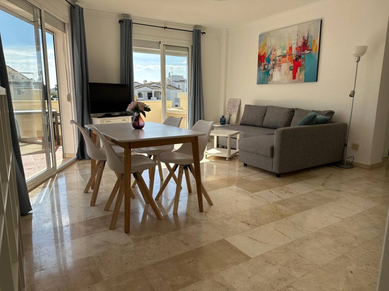 Equipado con aire acondicionado, calefacción eléctrica y suelos de mármol. Además, cuenta con armarios empotrados, lavadero, parking, trastero, jardín comunitario, piscina exterior y piscina climatizada,